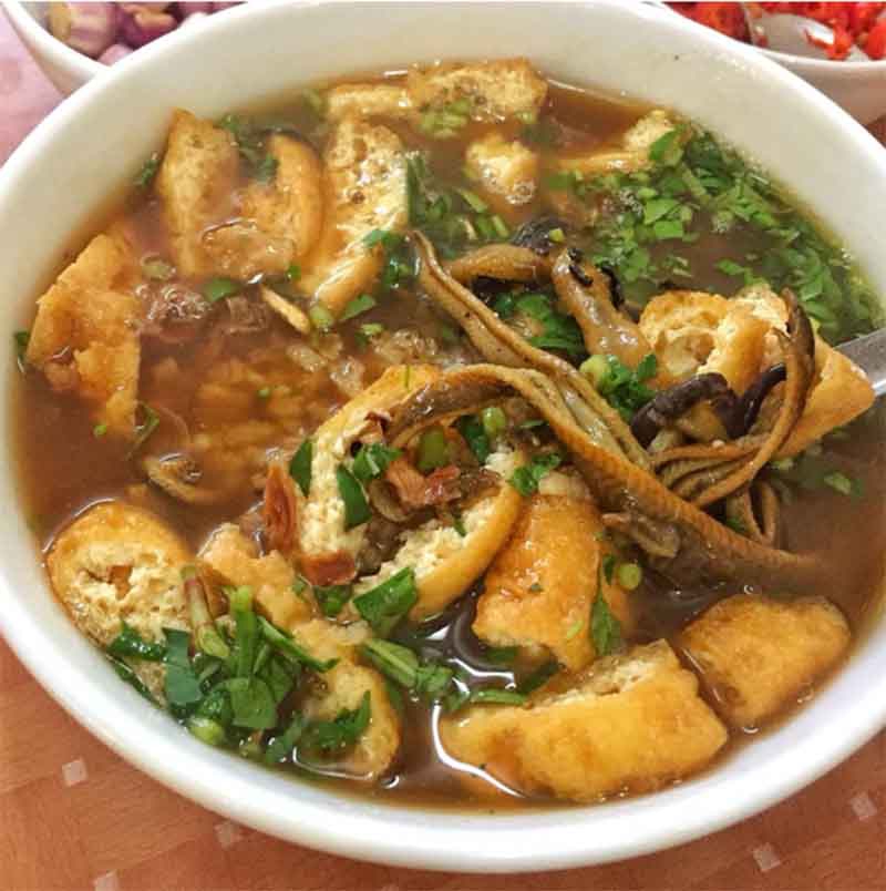 Khi thưởng thức, bạn có thể ăn cùng đậu rán hoặc một chút giá sống, rất mát và bổ. Sợi miến dai, thịt lươn giòn bùi, nước dùng đậm đà cùng vị thơm của các loại rau như kinh giới, tía tô, húng thơm... sẽ làm bạn phải nhớ mãi.
