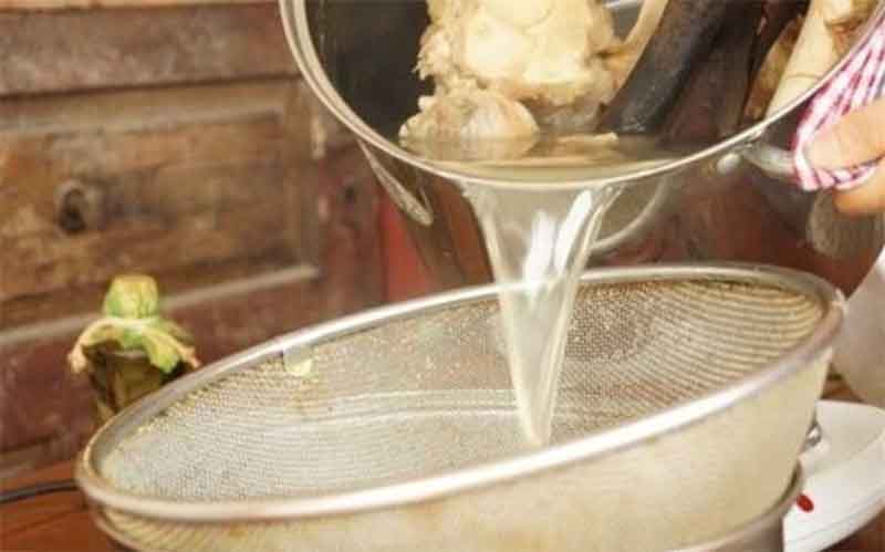 Tiếp theo là công đoạn nấu nước dùng. Thông thường, người ta thường ninh xương ống cùng tôm khô hoặc tôm tươi bóc nõn để giữ độ ngọt tự nhiên, ninh càng lâu thì nước dùng càng ngon càng ngọt. Đặc biệt là không thể thiếu một thìa nước hàng để tạo màu nâu đặc trưng của món cháo canh Thanh Hóa.