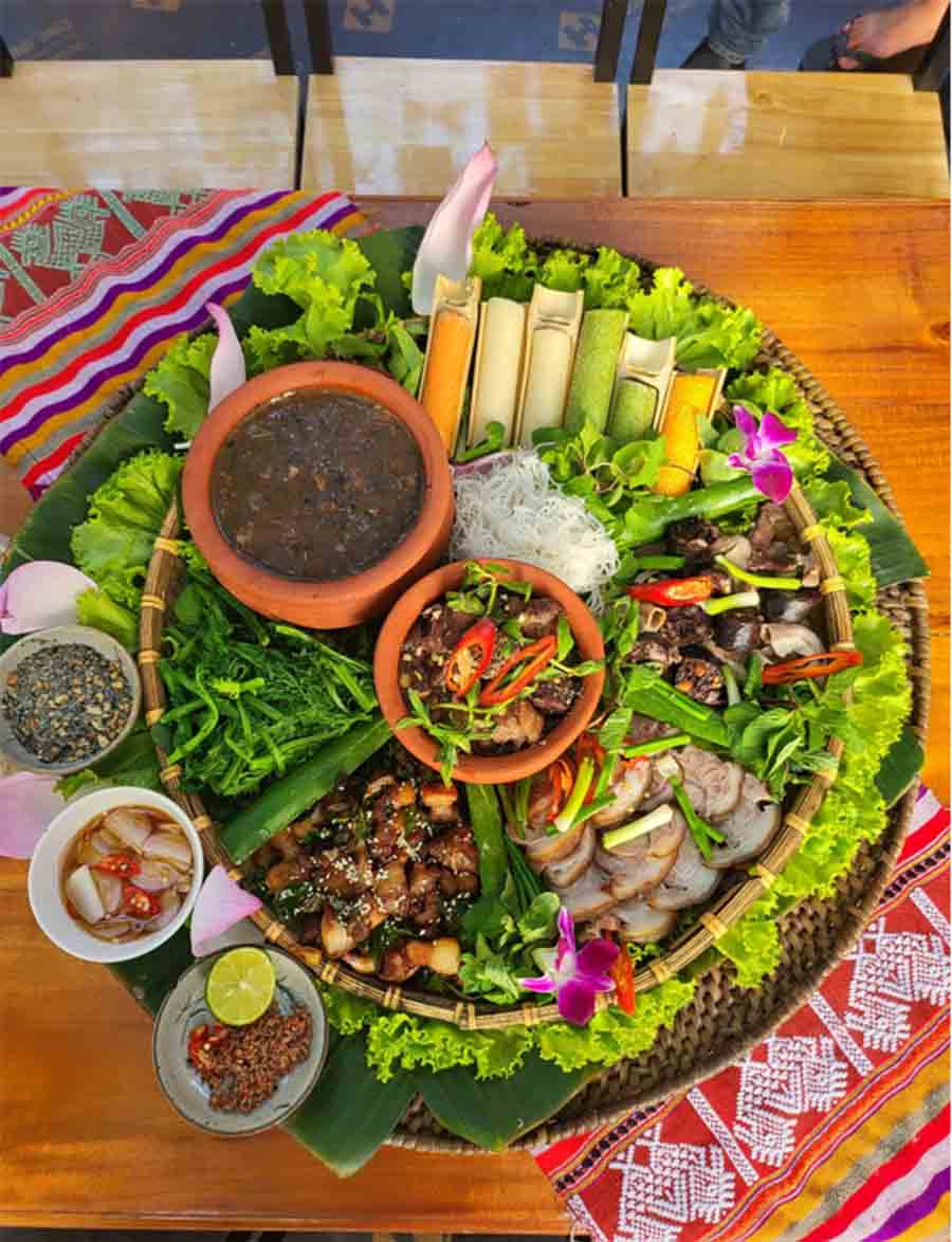Đến nhà hàng bạn có thể chọn món theo thực đơn hoặc theo set menu Mẹt lá Tây Bắc. Có nhiều món ngon như lợn bản, gà đen, thắng cố, cơm lam, xôi ngũ sắc.., mỗi món ăn có mỗi mùi hương “cuốn hút” riêng như gói trọn cả hương rừng Tây Bắc trong đó Mẹt lợn bản