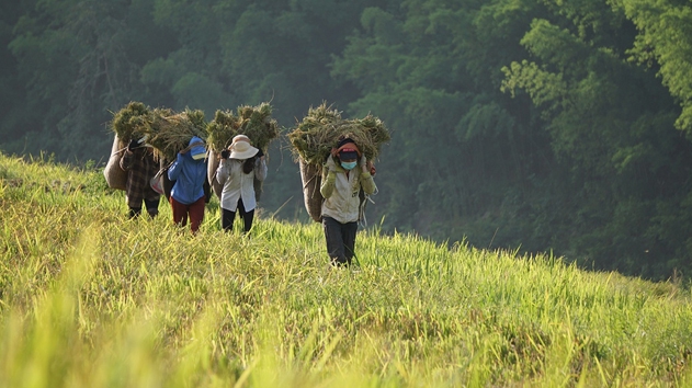 Do đường đi nhỏ và uốn theo bìa ruộng, nên gùi lúa ngoài sức mạnh còn yêu cầu người gùi phải rất khéo léo, nếu không đễ bị trượt chân ngã (ảnh thanhnien.vn)